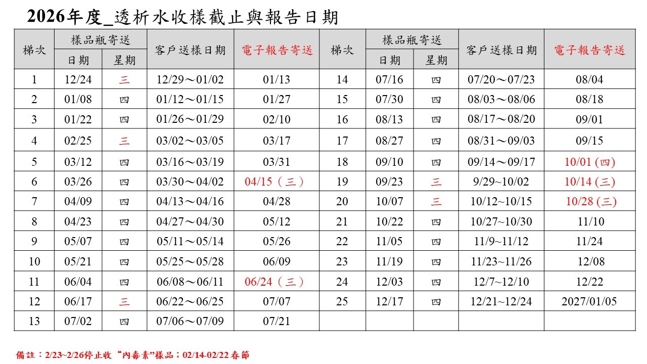 *透析用水檢驗樣品,固定於每月第一週收件,每月月中前後交付電子及紙本報告。 *無法配合固定送件時間者,歡迎來電洽詢客製化方案。 *本實驗室網址:https://rc.csmu.edu.tw/p/412-1018-23.php E-mail:csmuhtc@gmail.com 業務諮詢專線:04-3609-7722 #26010 章經理